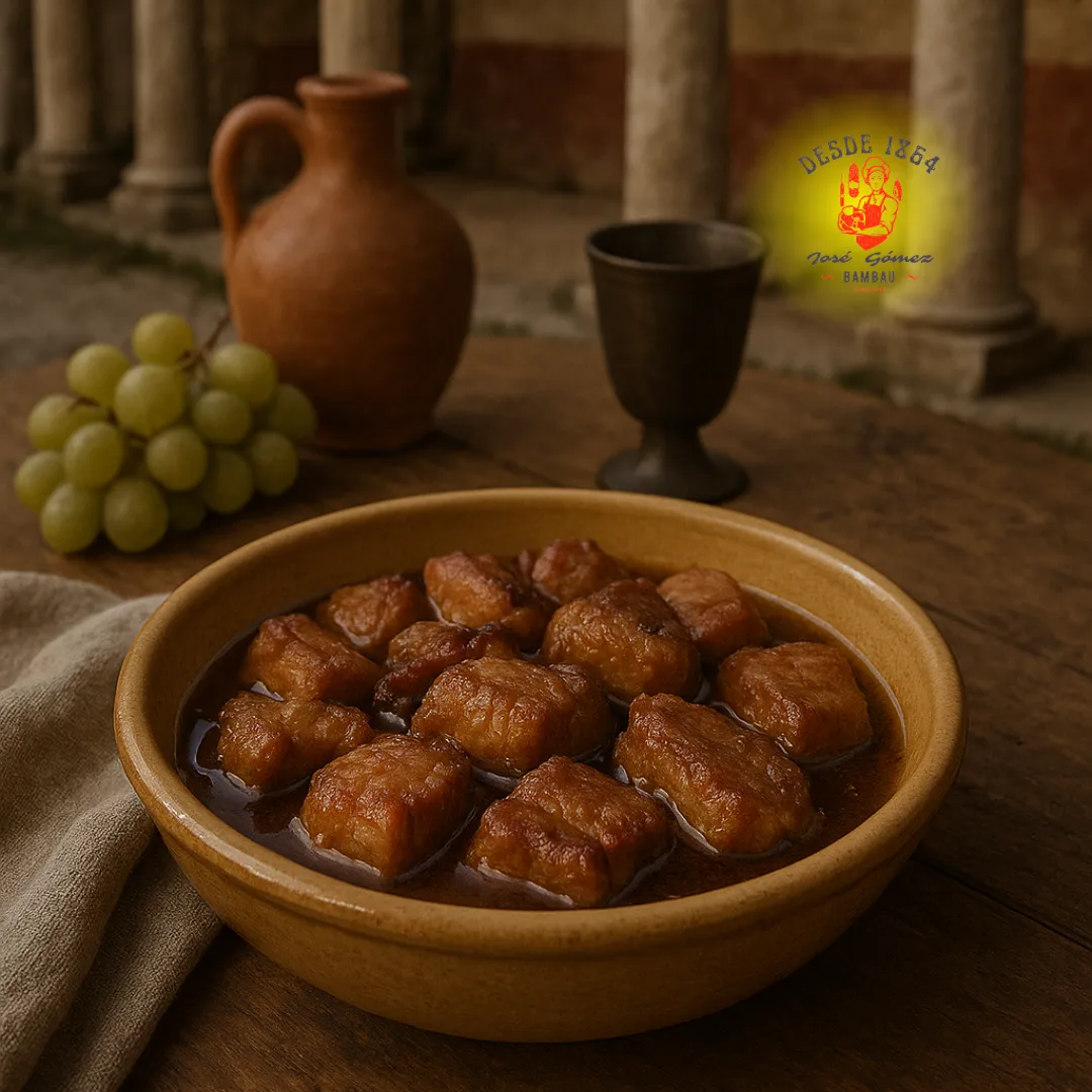 Este plato combinaba vino, miel y hierbas aromáticas, creando una salsa densa y perfumada, entre un estofado y un glaseado. Era un plato de celebración, ideal para banquetes y festines, y hoy lo recuperamos con un toque moderno y productos de proximidad.